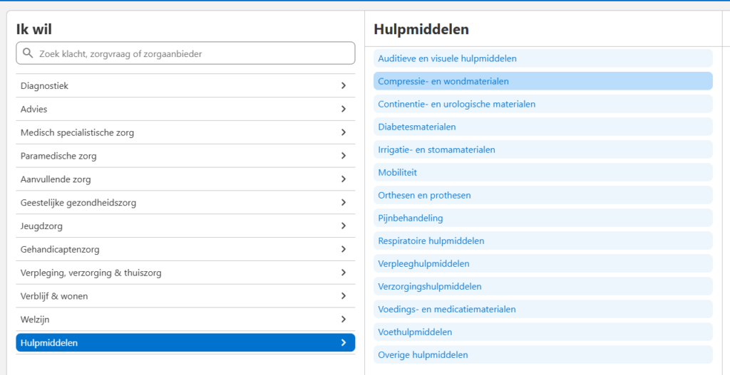 Wilt u als zorgverlener een bestelling plaatsen? Open dan ZorgDomein en selecteer de zorgvraag die voor uw patiënt van toepassing is. Wanneer u voor Wondhuis een aanvraag doet, kiest u hierbij de categorie Hulpmiddelen, die onderaan de lijst te vinden is. Zodra u deze categorie heeft geselecteerd, wordt u automatisch meegenomen naar de volgende stap in het aanvraag proces.