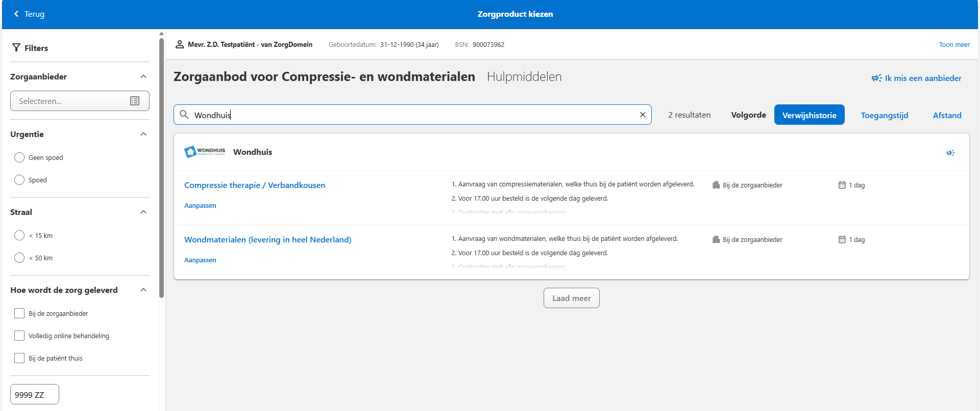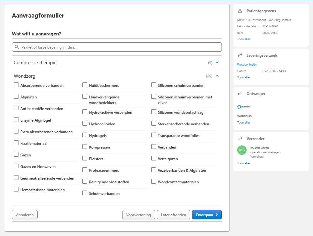 In dit scherm ziet u een overzicht van alle aanbieders die compressie- en wondmaterialen leveren. Via de zoekfunctie kunt u eenvoudig zoeken op Wondhuis. Zodra onze naam verschijnt, klikt u op het product dat u via ons wilt aanvragen om verder te gaan binnen het bestelproces.