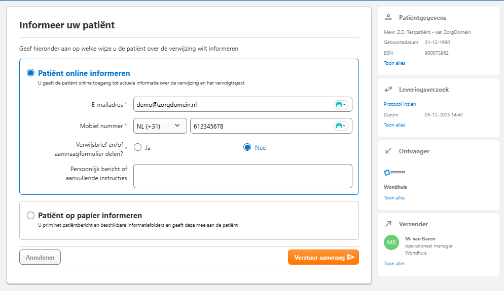 Vervolgens geeft u aan op welke manier de patiënt geïnformeerd moet worden over de verwijzing. U kiest eenvoudig de gewenste optie, zodat duidelijk is hoe en via welk kanaal de patiënt bericht ontvangt.